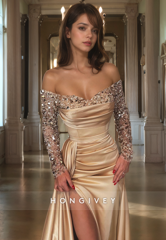 Chic Satin Fitted Sweetheart Sequined Off-Shoulder Empire Long Prom Dress
