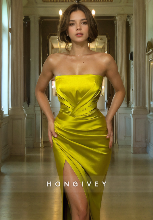 Sheath/Column Strapsless Pleated Satin Prom Dress with High Slit