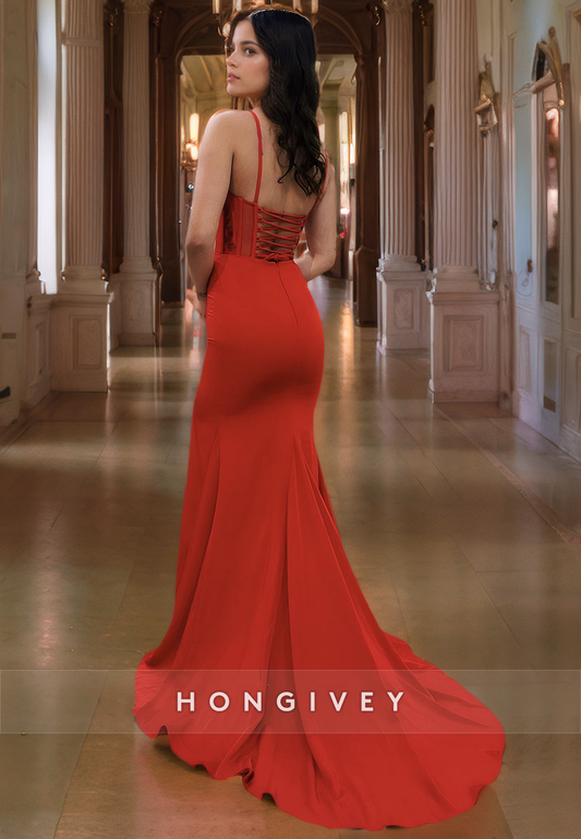 Trumpet/Mermaid V-Neck Straps Satin Prom Dress with High Slit
