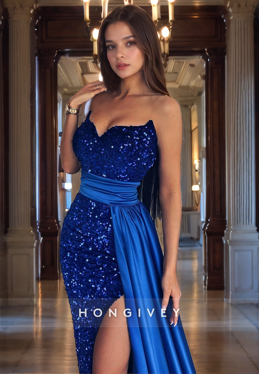 Trumpet/Mermaid Strapless Sequin Top Prom Dress with High Slit