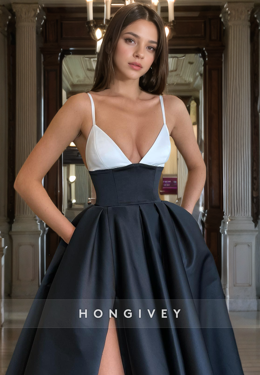 A-Line Low-V-Neck Floor-Length Satin Prom Dress with High Slit and Pockets