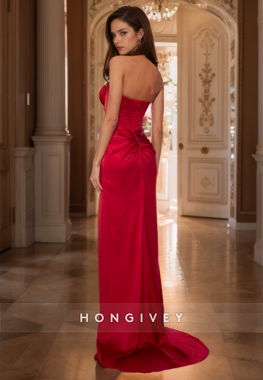 Elegant Red Satin Sweetheart Night Party Dress Strapless High Split Mermaid Prom Dress