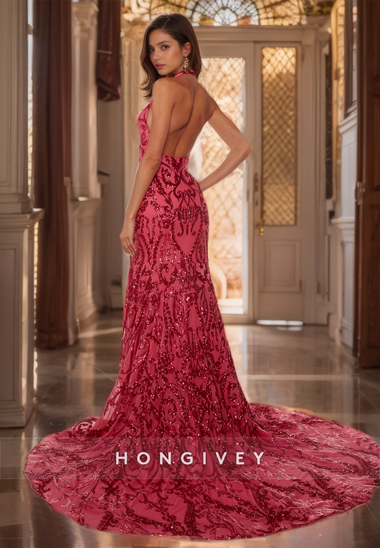 Flamingo Halter Lace Mermaid Prom Dress Backless Floor Length Sweep Train Cocktail Dress