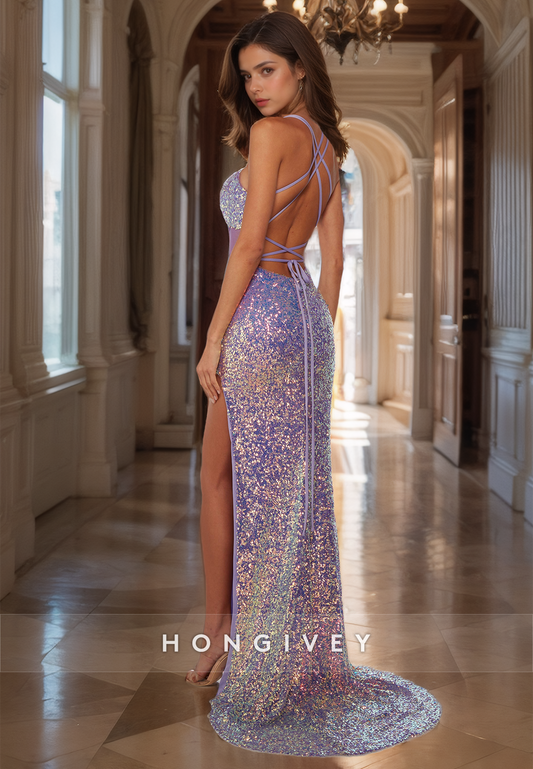 Sparkly Mermaid Lilac Spaghetti Straps Cocktail Dresses Corset Back Floor Length Sequins Prom Dress