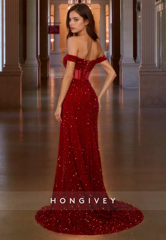 Sparkly Column Red Sequins Prom Dress with High Split Off-Shoulder Lace Up Cocktail Dresses