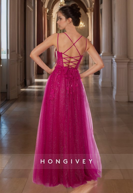 A-Line Graceful Fuchsia Tulle Prom Dress Floor Length Lace Up Evening Party Gown
