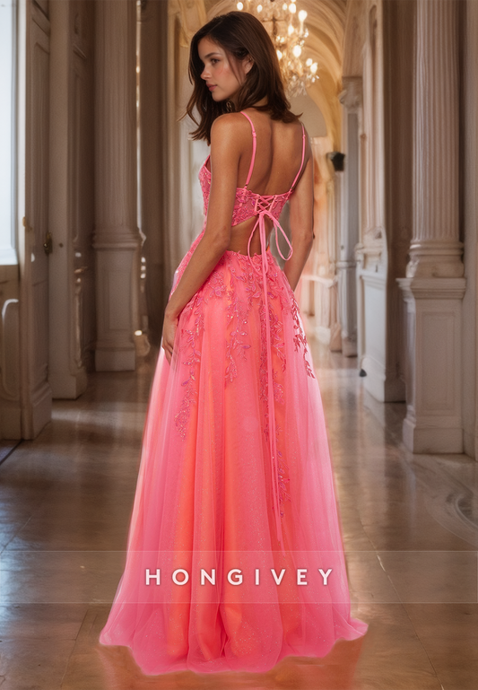 Luxurious V Neck Flamingo A-Line Prom Dress Floor Length Straps Appliqued Quinceanera Dresses