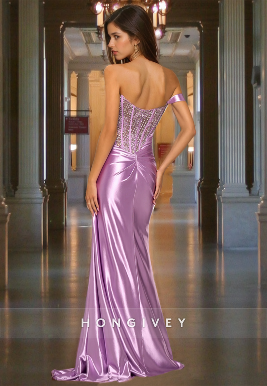 Stunning Off-Shoulder Lilac Mermaid Prom Dress Beads Sleeveless Satin Quinceanera Dress