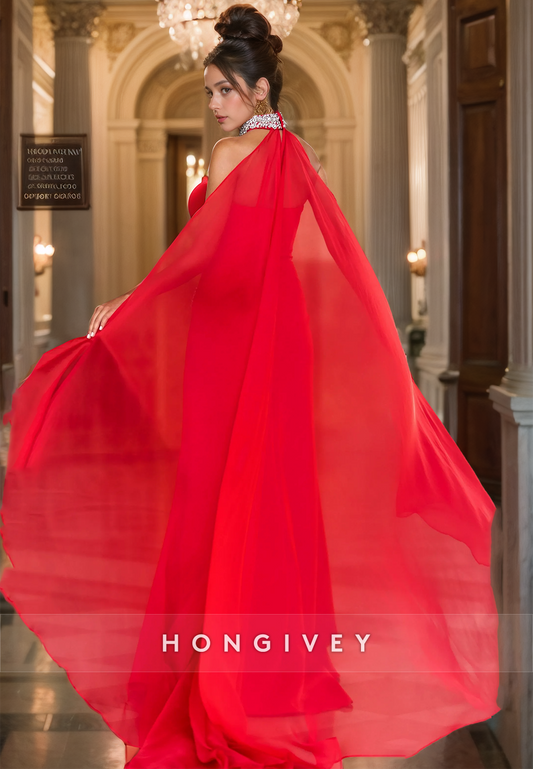 Elegant Red Chiffon High Neck Prom Gown Beads Strapless High Slit Party Dress
