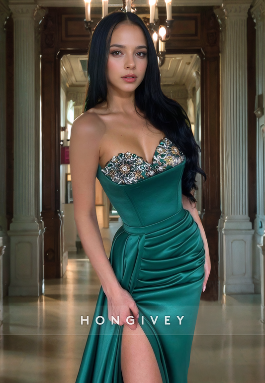 Elegant Peacock Sweetheart Beads Prom Formal Dress Satin Side Slit Strapless Evening Party Dress
