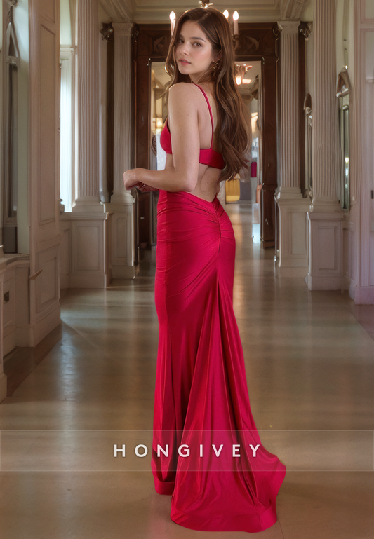 Satin Trumpet V-Neck Spaghetti Straps Illusion Long Prom Dress