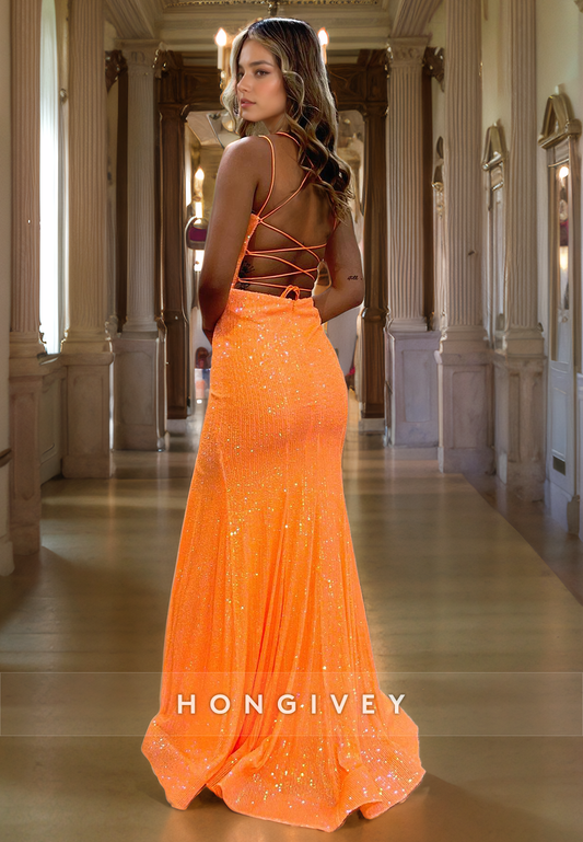 Glitter Trumpet V-Neck Spaghetti Straps With Side Slit Long Prom Dress