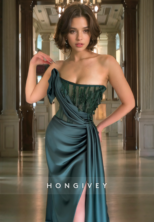 Satin A-Line Strapless Beaded Empire With Side Slit Long Prom Dress