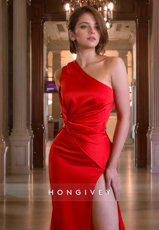 Sheath/Column One Shoulder Court Train Red Satin Prom Dress with High Slit