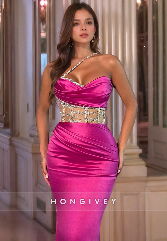 Sheath/Column One Shoulder Cutout Satin Prom Dress with High Slit and Rhinestone Sashes