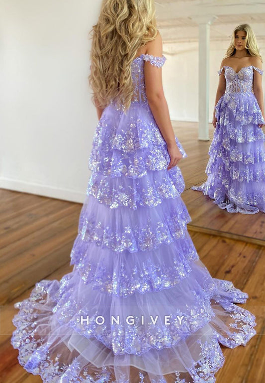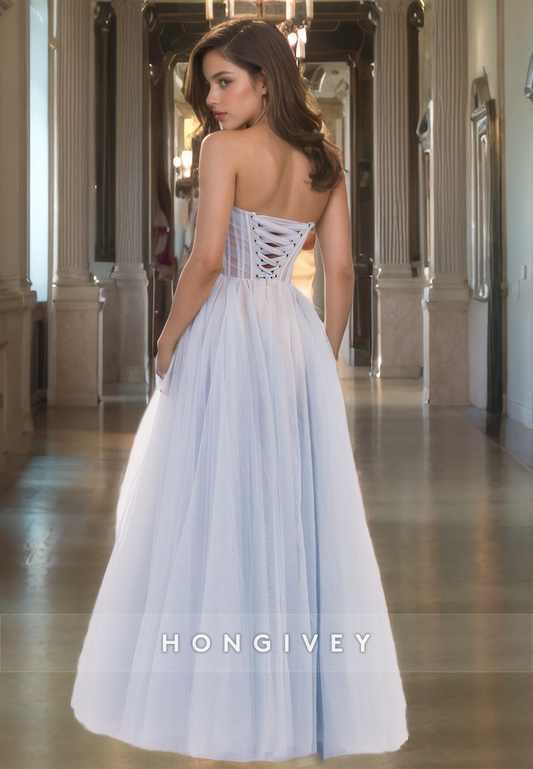 L2497 - Sexy Tulle A-Line Strapless Sleeveless Empire Tiered With Train Party Prom Evening Dress