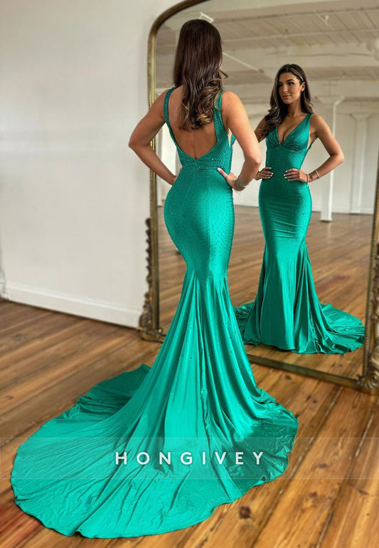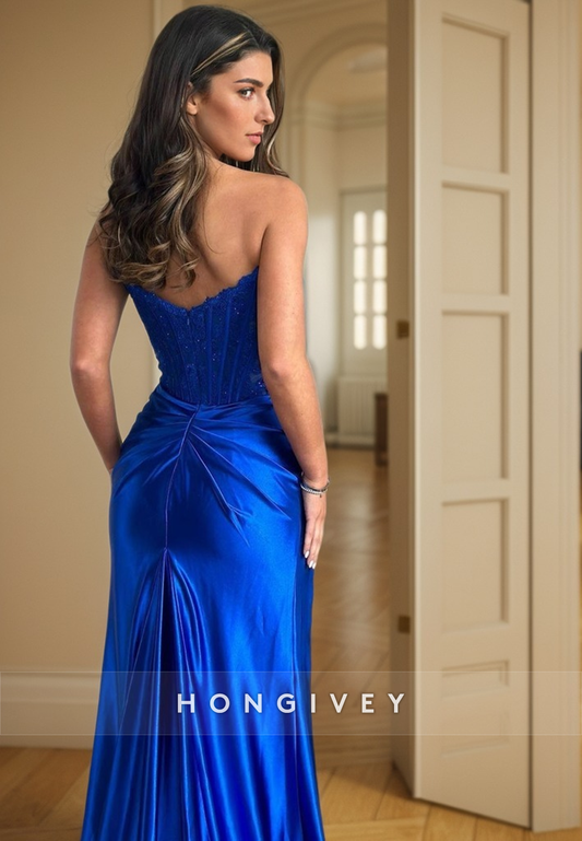 L2473 - Sexy Satin Trumpet V-Neck Strapless Empire Beaded With Side Slit Train Party Prom Evening Dress