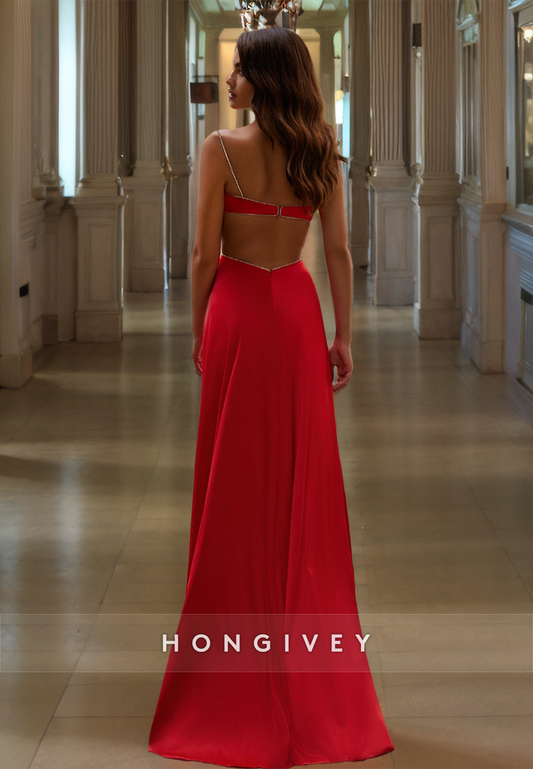 L1332 - Simple & Casual Satin Sweetheart Spaghetti Straps With Side Slit Party Prom Evening Dress