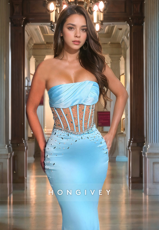 Sexy Fitted Strapless Illusion Rhinestone Embellished Trumpet Party Prom Evening Dress