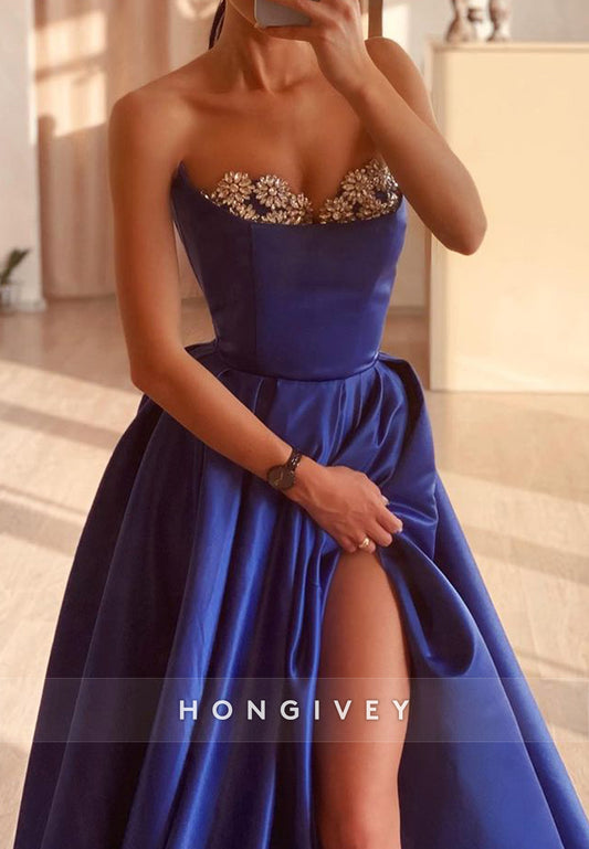 L1338 - Classic & Timeless Satin Bateau Strapless Empire With Side Slit Party Prom Evening Dress