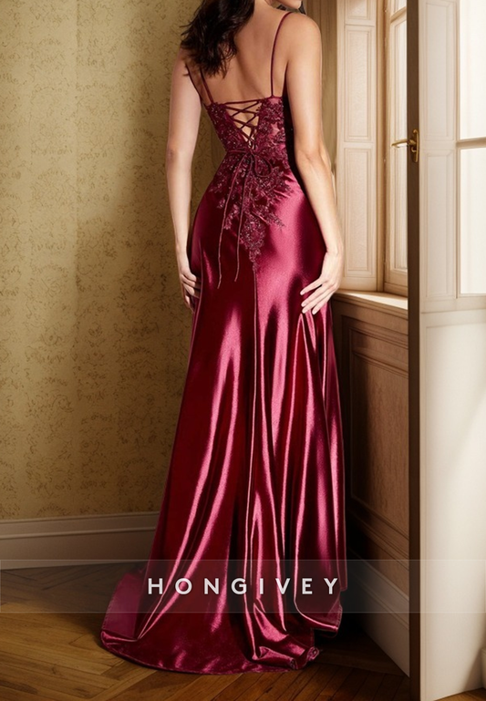 Satin Sweetheart Spaghetti Straps Lace Applique With Side Slit Long Prom Dress
