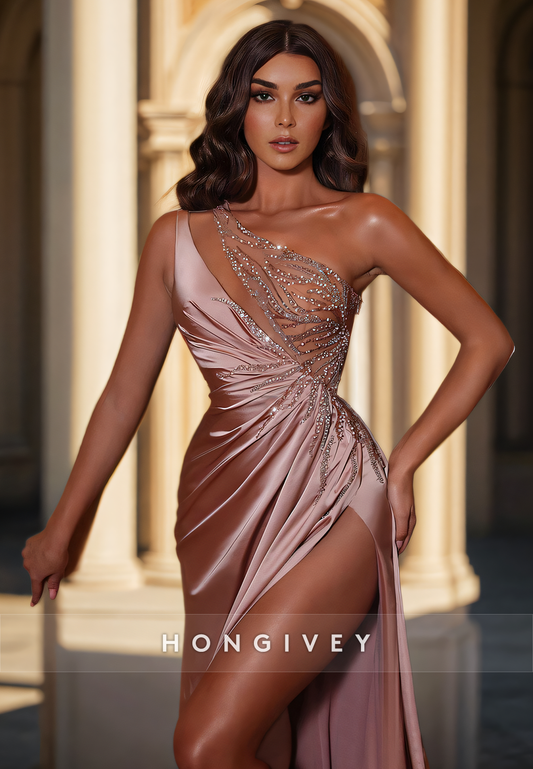 L2470 - Sexy Satin Trumpet One Shoulder Sleeveless Empire Beaded With Side Slit Party Prom Evening Dress