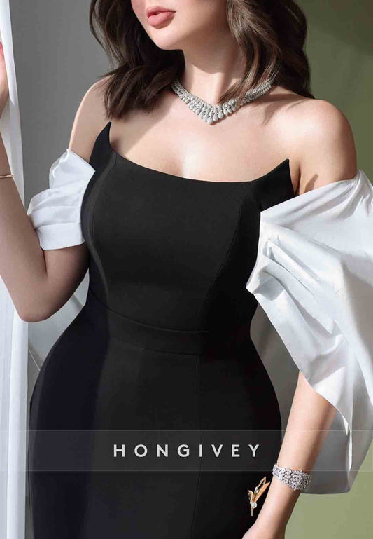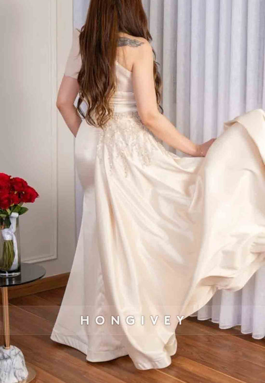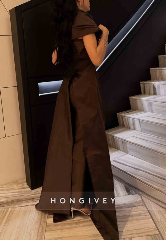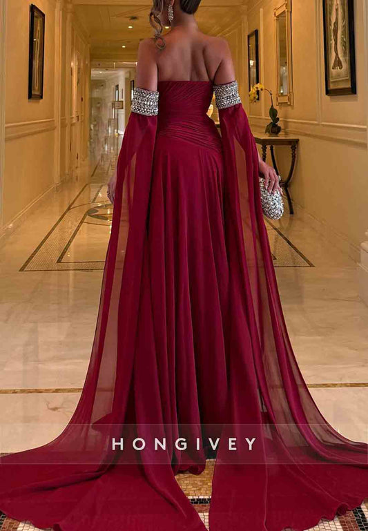 HIgh Slit Strapless Half Sleeves Column Floor-Length Pleated Evening Gowns