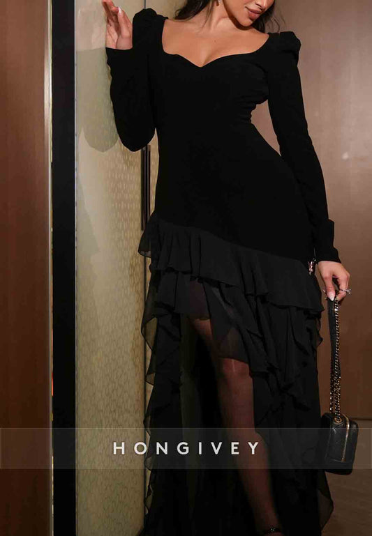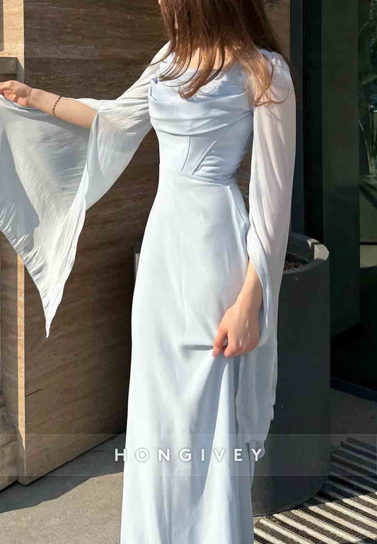 Long Sleeves Pleated Low Back Asymmetrical Floor-Length Evening Gowns