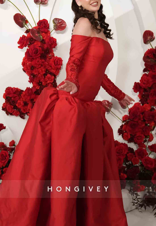 Off the Shoulder Long Sleeves Pleated Floor-Length Princess Evening Gowns