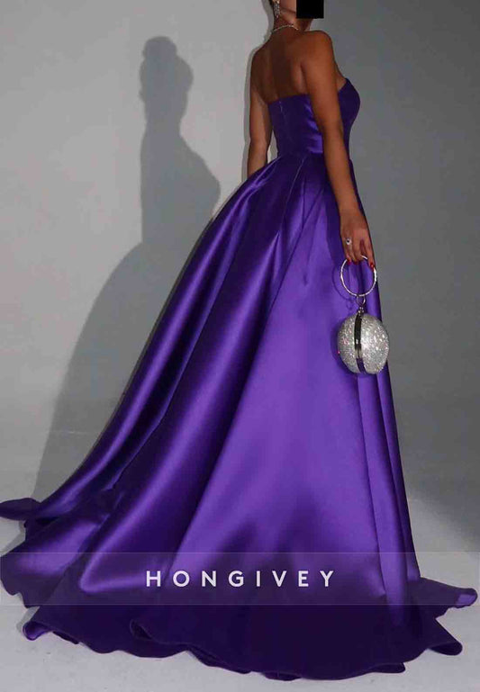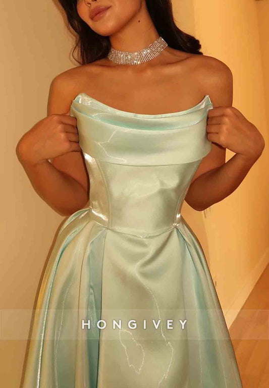Side Slit Strapless Floor-Length A-Line Sleeveless Pleated Evening Gowns