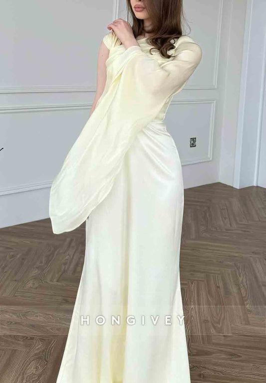 One Shoulder Floor-Length Pleated Long Sleeves Evening Gowns