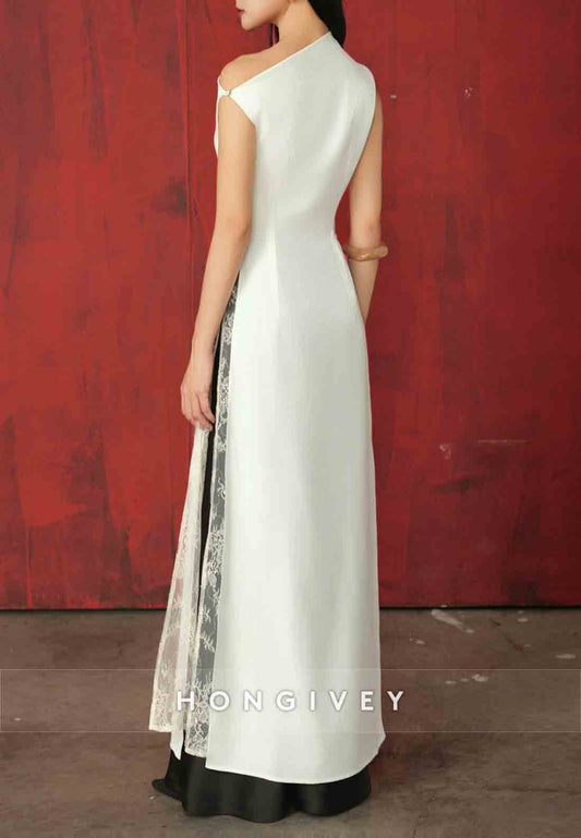 One Shoulder Simple Floor-Length Sleeveless Lace Pleated Evening Gowns