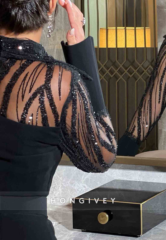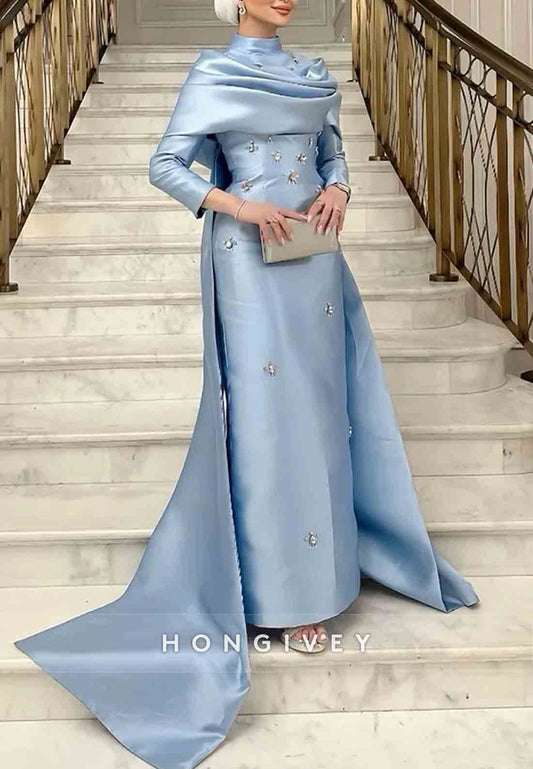 Shawl Column High Neck Long Sleeves Satin Appliqued Evening Gowns