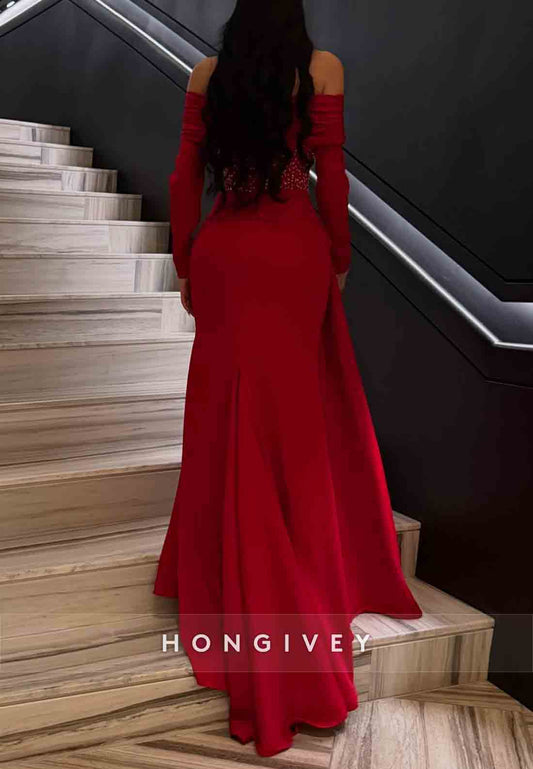 Long Sleeves Formal Gowns Side Slit Shoulder Flower Floor-Length Evening Gowns