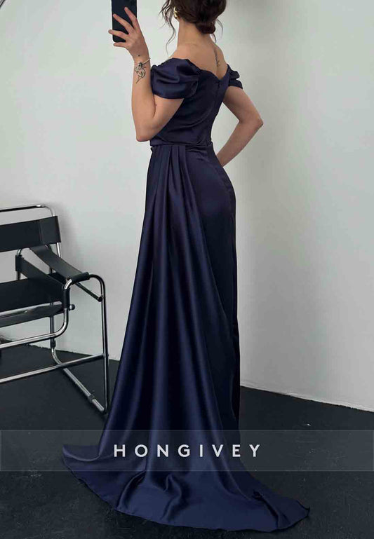 Off the Shoulder Side Slit Satin Ruched Trumpet Floor-Length Evening Gowns