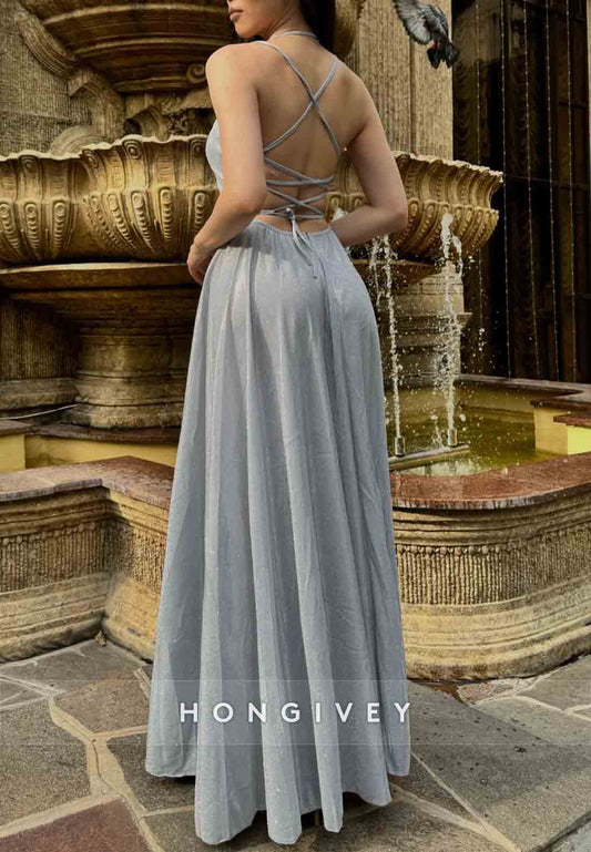 Glitter Side Slit Evening Gowns Sleeveless A-Line Halter Tie Back Evening Gowns