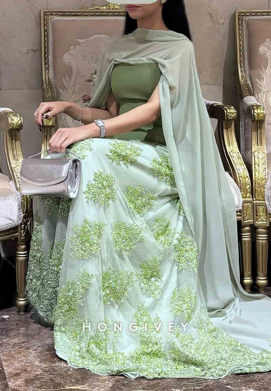 Shawl Trumpet Satin Shoulder Flowers Cloak Floor-Length Evening Gowns