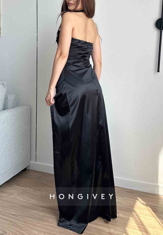 Halter Sheath High Slit Floor-Length Low Back Sleeveless Pleated Evening Gowns