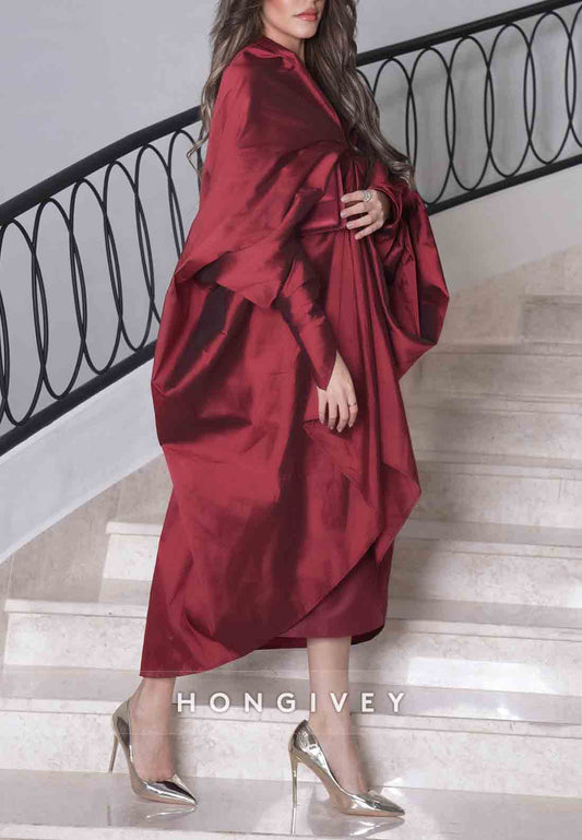 Shawl Column Long Sleeves Pleated Tea-Length Burgundy Evening Gowns