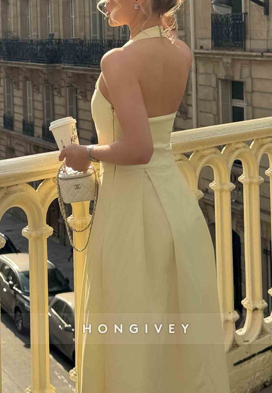 Simple Halter Tie Back A-Line High Slit Guest of Wedding Evening Gowns