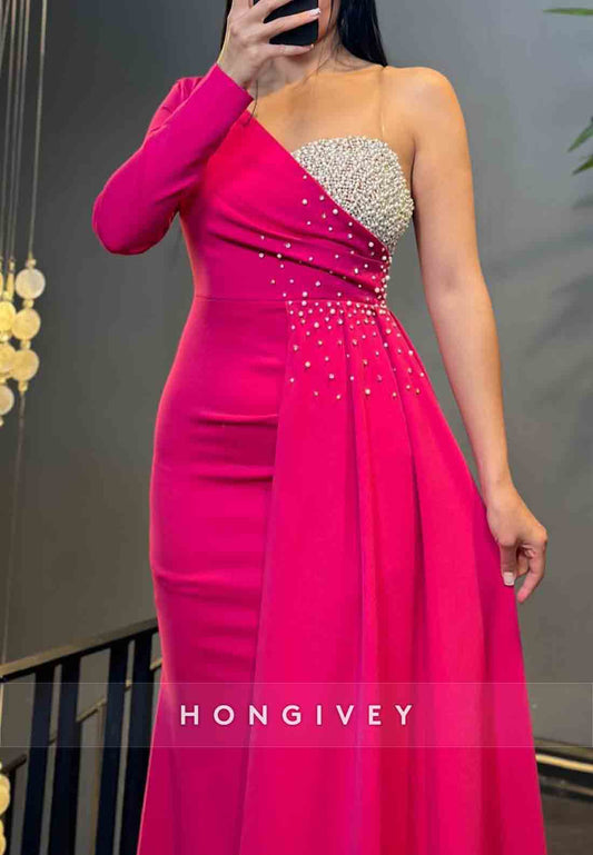 One Shoulder Side Draping Beading Floor-Length Trumpet Evening Gowns