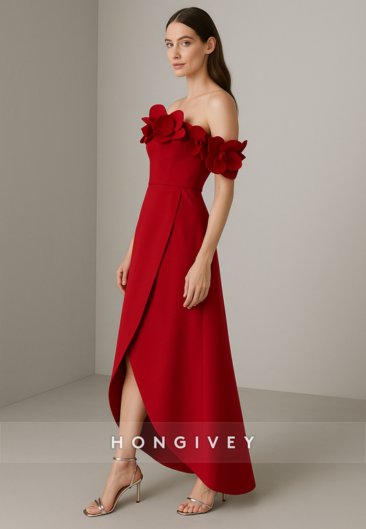 Red Flowers Off the Shoulder Column Pleated Simple Evening Gowns