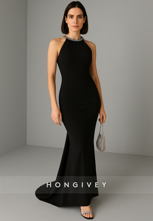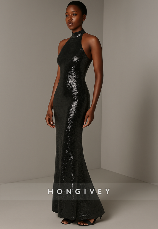 Halter Trumpet Floor-Length Sleeveless Glitter Evening Gowns