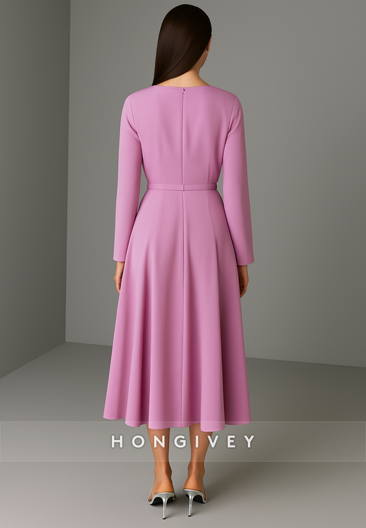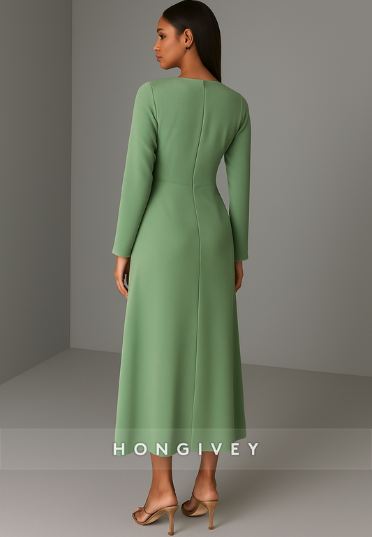 Long Sleeves Simple Pleated Tea-Length A-Line Evening Gowns