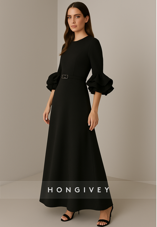 Scoop Pleated 3/4 Sleeve Formal Gowns A-Line Waistband Ankle-Length Evening Gowns