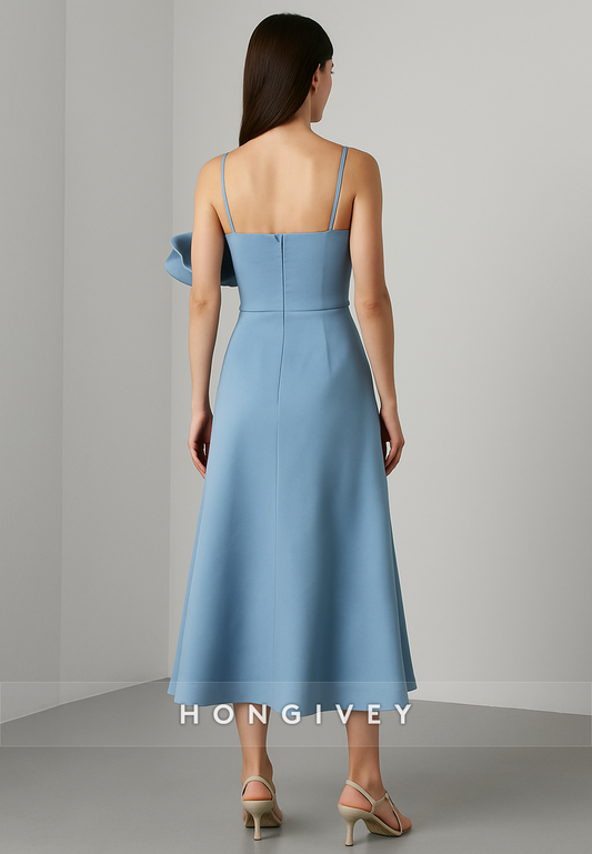 Spaghetti Straps A-Line Tea-Length Pleated Sleeveless Evening Gowns
