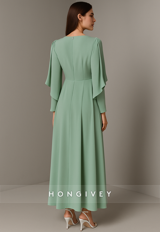 Long Sleeves Pleated A-Line Flutter Sleeves Ankle-Length Evening Gowns