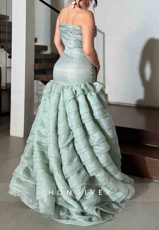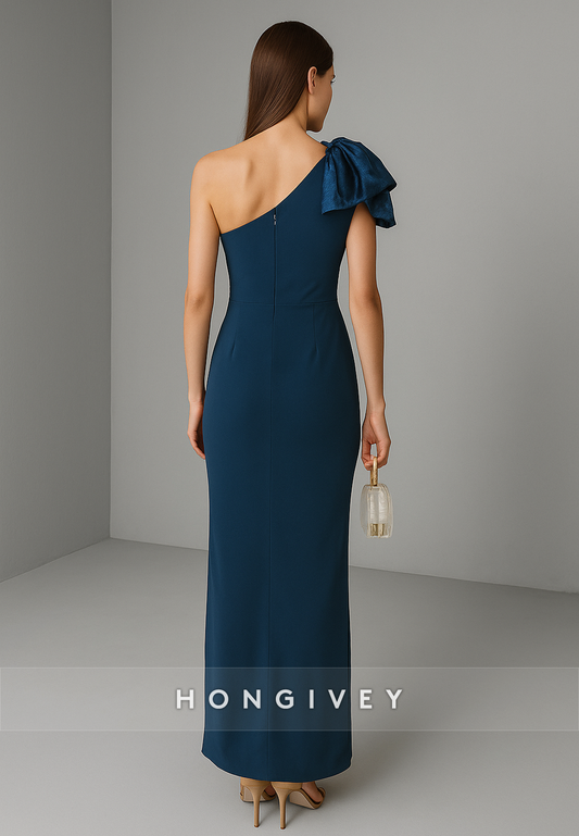 One Shoulder Low Back Floor-Length Pleated Trumpet Evening Gowns