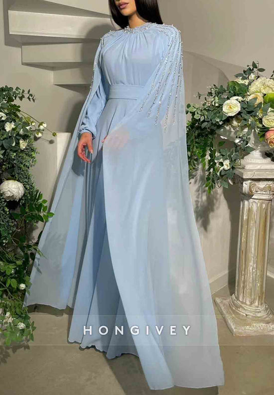Long Sleeves Chiffon Pleated Floor-Length Beading Column Evening Gowns