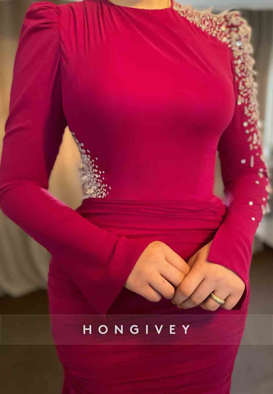 Floor-Length Long Sleeves Beading Mermaid Pleated Evening Gowns